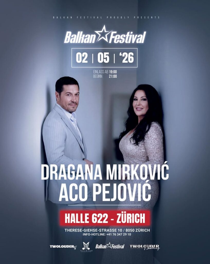 Dragana Mirković i Aco Pejović nastupaju zajedno u dvorani Halle 622 u Cirihu. Veče ispunjeno bezvremenskim hitovima, emocijama i vrhunskom koncertnom atmosferom.
